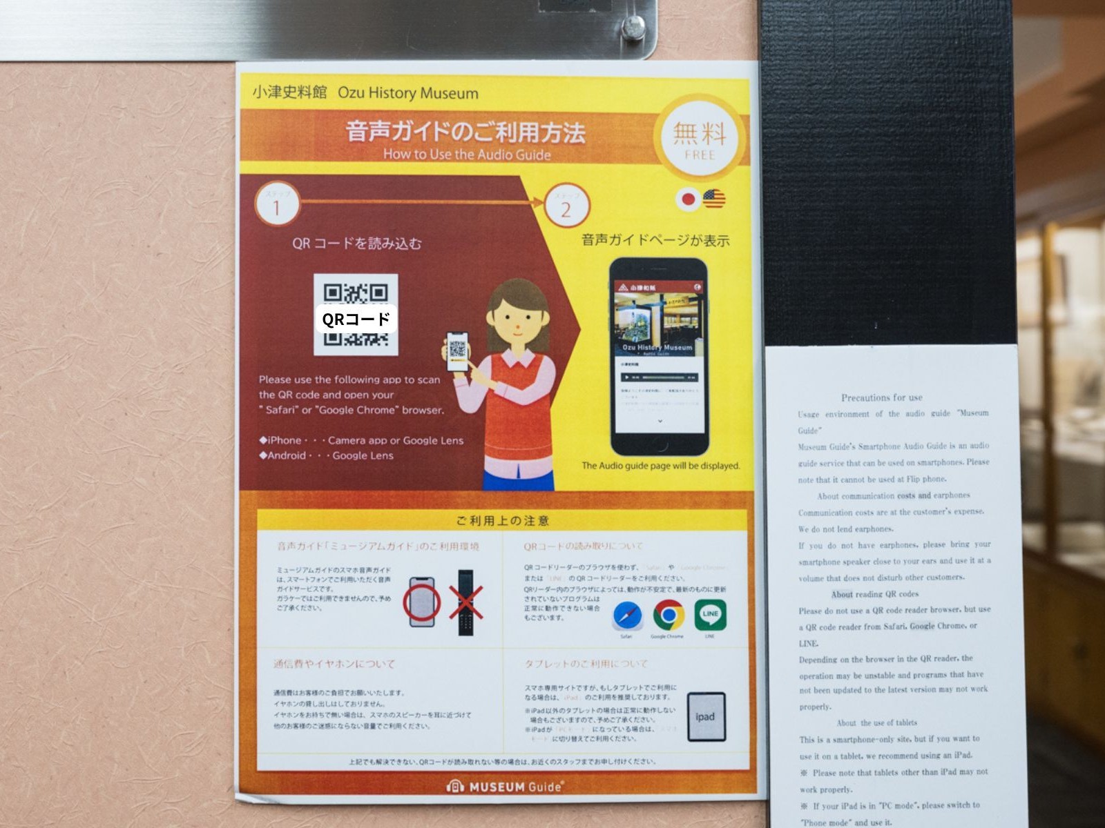 検討を重ねた結果、館内に音声ガイドのリンクページへと誘導するQRコードを掲示し、お客様にご自身のスマートフォンで読み取っていただく形式を採用することとなった。無料Wi-FiのIDとパスワードもあわせて掲示しており、スマートフォンさえあれば、どなたでも気軽に利用できる仕組みである。音声ガイドは、日本語と英語の2言語で制作することにした。
