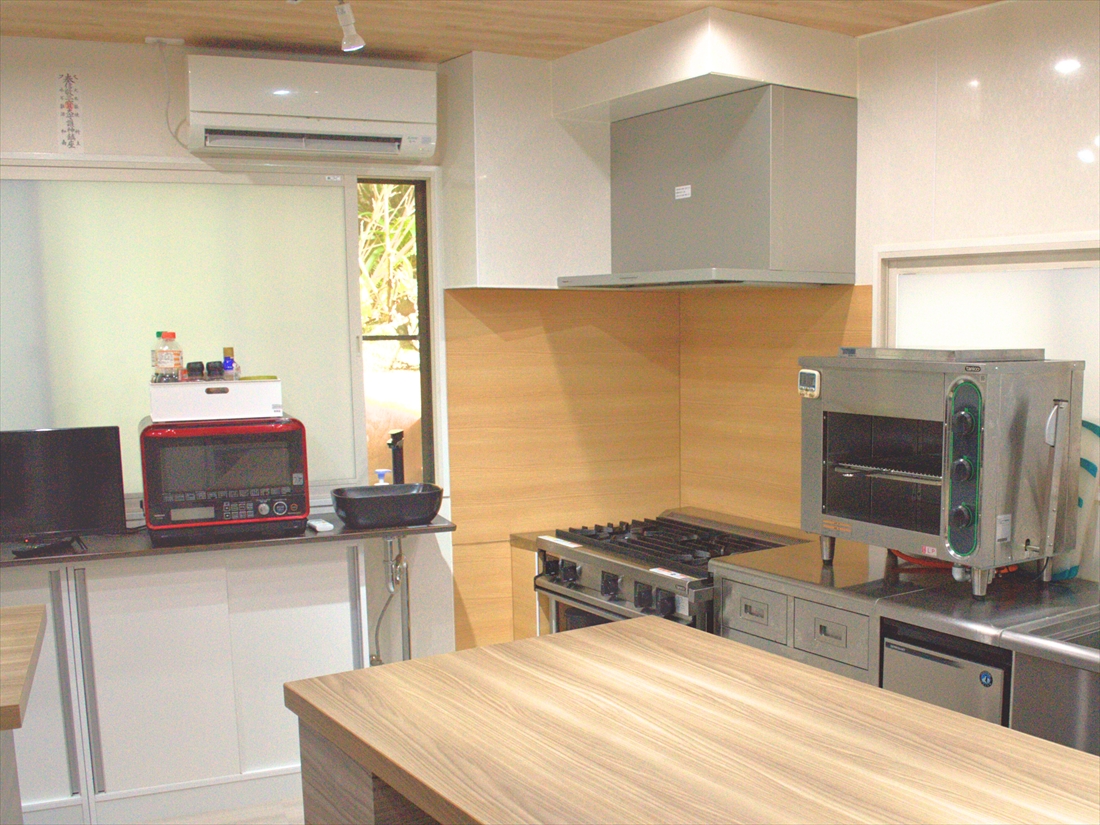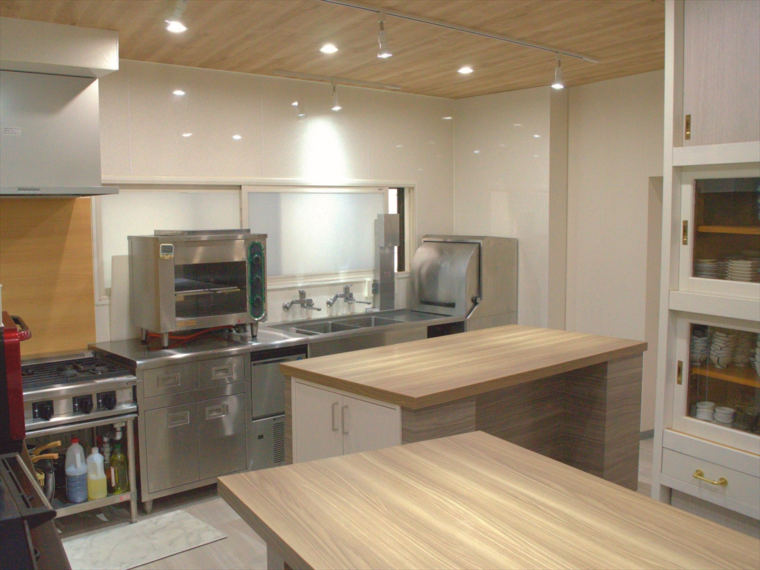 参加者が立ち入る床や、天井・壁は全面的に張り替え。壁は白の化粧板を採用してモダンに、床と天井は木目調でナチュラルな雰囲気を取り入れた。料理に不慣れな参加者も安全に作業できるよう、照明は手元を明るく照らし、位置が自由に変えられるレールライトを導入した。また、調理体験でも利用するガステーブルや赤外線グリル、冷凍冷蔵庫、製氷機などの厨房機器も更新。最大6人程度の受け入れを想定し、参加者同士がぶつかり合わないように広い空間を取るため、小型化できる機器は小さなものを選んだ。