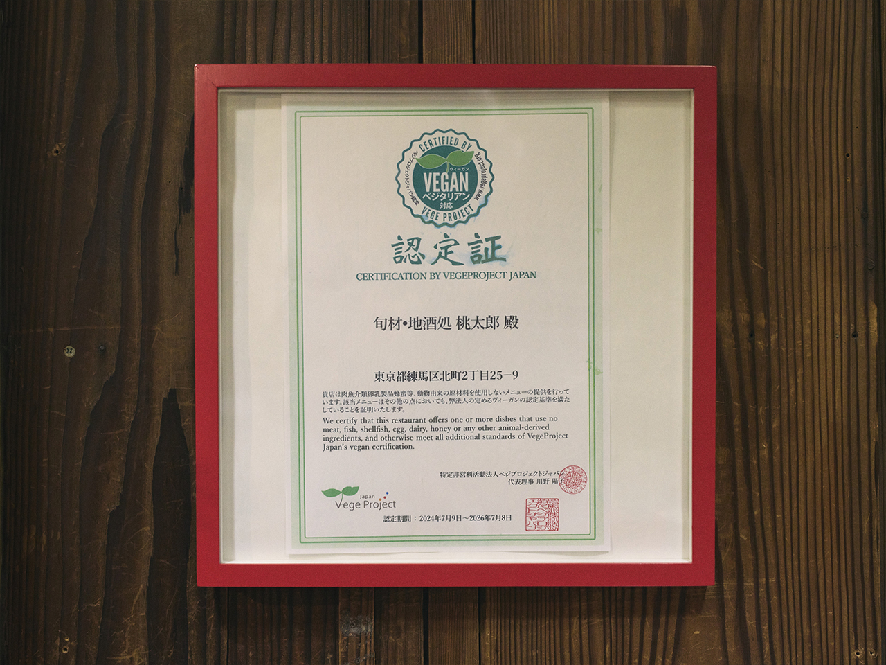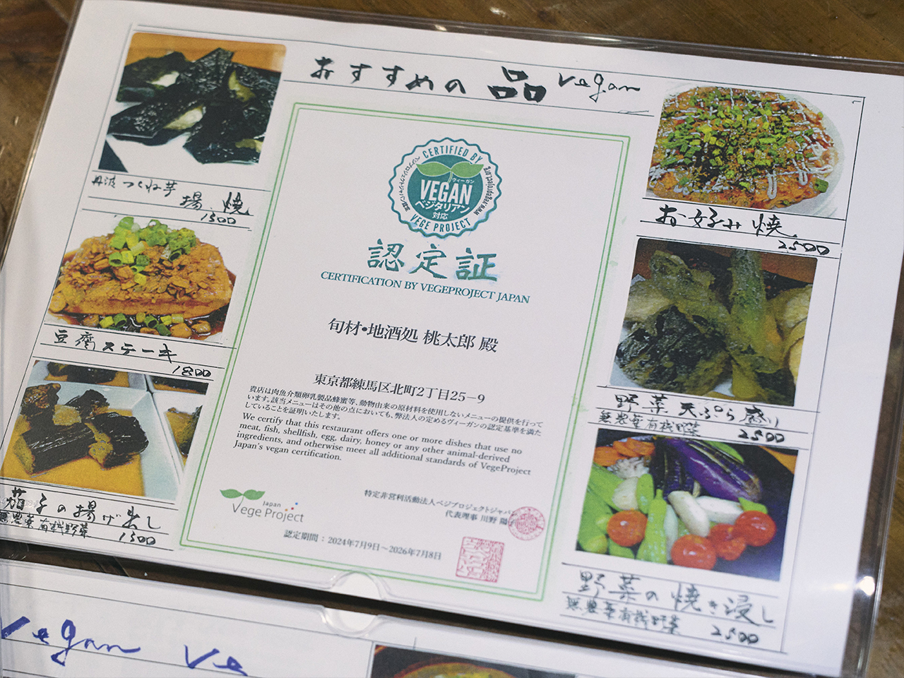 大塚代表は、NPO法人ベジプロジェクトジャパンに「メインとなるメニューにヴィーガン対応を含むベジタリアン料理の選択がある飲食店」としてヴィーガン認証の申請を行った。
