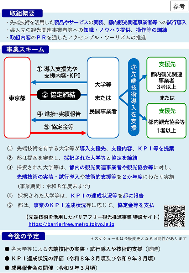 この度、バリアフリー等に役立つ先端技術の観光分野での実装に取り組む大学や民間事業者を採択しましたのでお知らせします。採択された大学等は、東京都と協定を結び本事業の成果へのKPI評価委員会の結果を踏まえ資金面等での支援を受けられます。